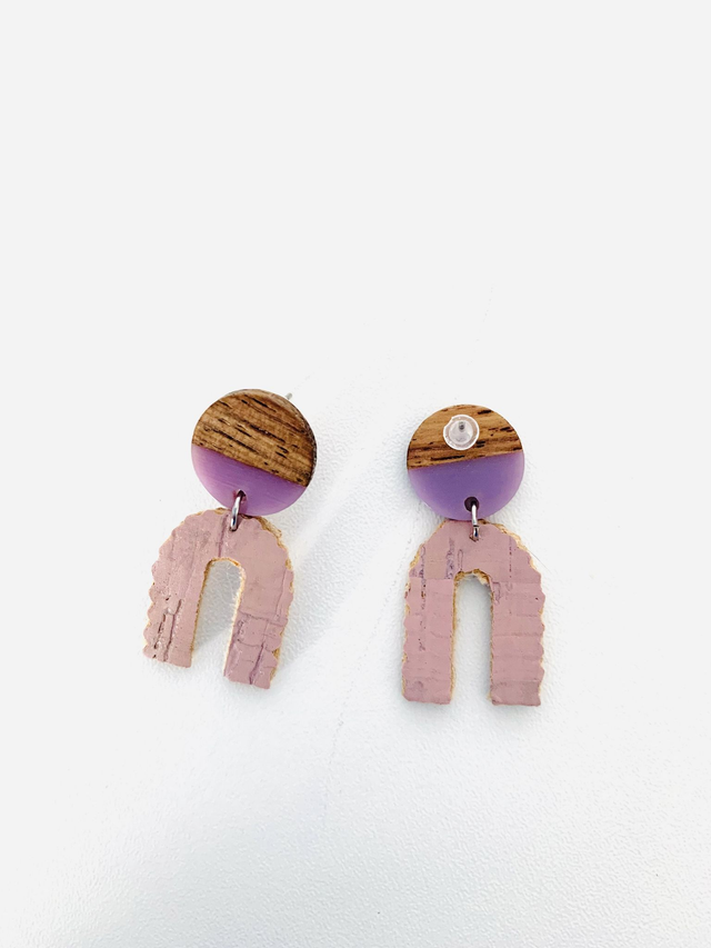 Boucles d'oreilles clous en bois et en résine composées d'un élément en liège.